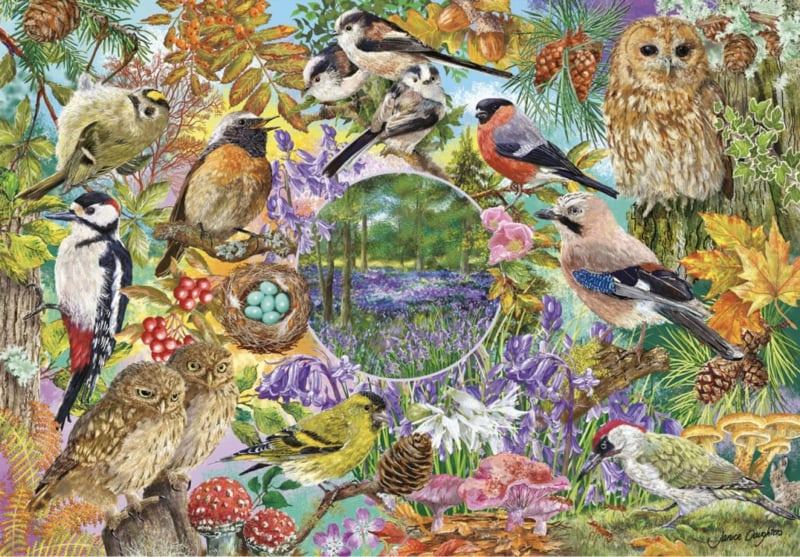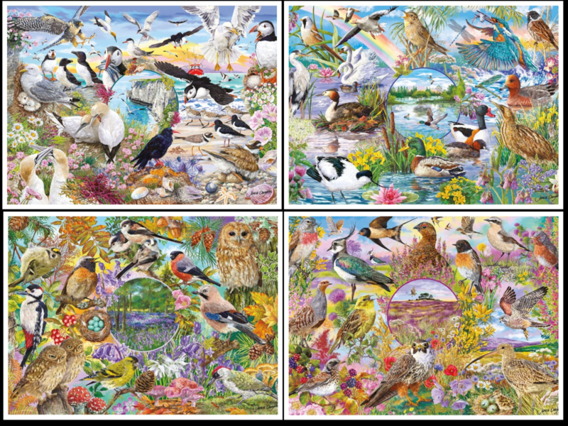 Set van 4 puzzels met natuur- en Vogelillustraties met de titels