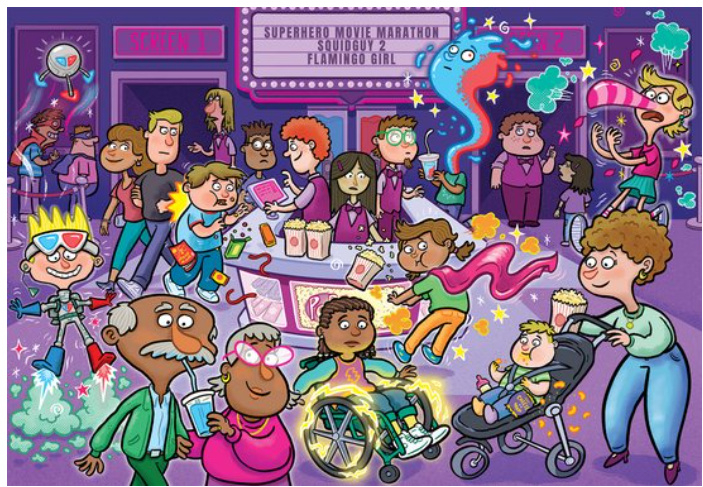 Er is een ultiem filmfestijn over superhelden in de bioscoop. Iedereen staat in de rij voor popcorn, snoepjes en slush puppy. Maar ineens gebeuren er vreemde dingen bij de kassa ... Schoenen beginnen te smelten, vonken vliegen door de lucht en iemand begint te zweven! Zou het maar verbeelding zijn of gaan de bezoekers iets te veel op in de films? Gebruik je fantasie en puzzel wat er hierna gebeurt.